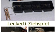 Hier werden Hundeträume wahr 🙂 Was es braucht 1 stabile Schachtel mit einer Schublade (zum Beispiel eine Keksschachtel) 1 Stück Schnur 1 Holzstückchen oder Plättchen Leckerchen BastelanleitungBefestige die Schnur an der Stirnseite der Schublade und schneide bei der äusseren Schachtel ein Loch hinein durch dass ein Leckerchen passt. Schieb nun die Schublade wieder in die…