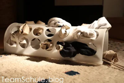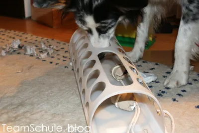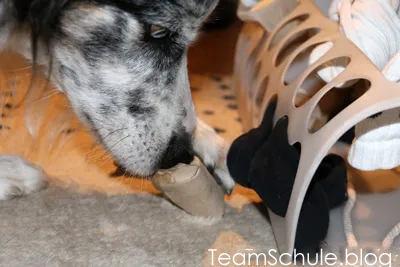 Damit die Socken nicht ganz zerstört werden, kannst du deinen Hund bitten, diese zu apportieren, so dass du ihm die Leckerchen rausgeben kannst. Dadurch wird es zum Spiel zu zweit und eher selbständige Hunde erfahren, dass sich die Zusammenarbeit lohnt 🙂