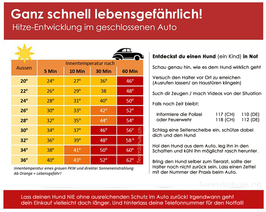 Je schneller die anschliessende Abkühlung beginnt, desto grösser ist die Überlebenschance des Hundes. Dies alles gilt selbstverständlich auch, wenn du ein Kind oder einen älteren Menschen in Not im Auto siehst.