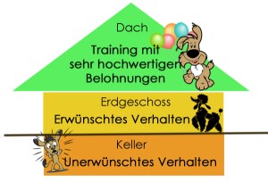 Ich vergleiche die Gegenkonditionierung gerne mit einem Haus, welches aus Keller, Erdgeschoss und Dachstock besteht. Im Keller findet das unerwünschte Verhalten statt, im Erdgeschoss zeigt der Hund das normale, erwünschte Verhalten und im Dachgeschoss feiern wir Party.