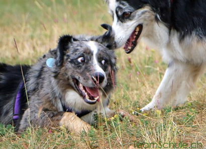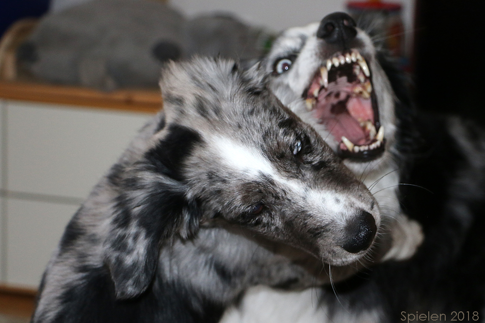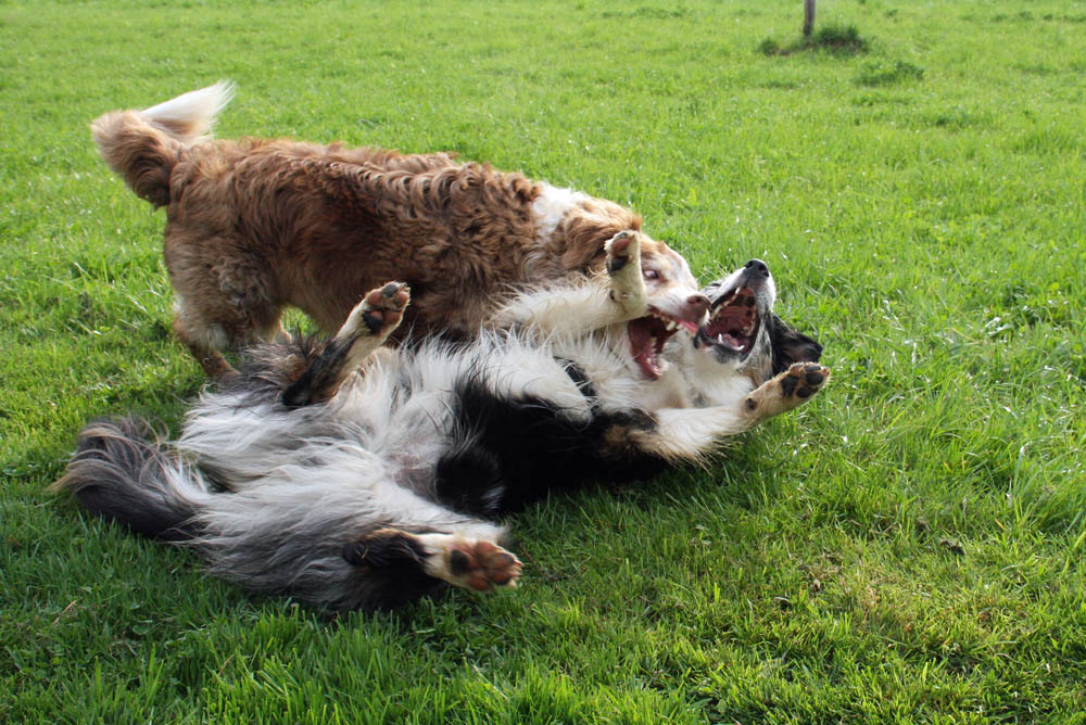Auch bei Kampf- und Rangelspielen ist die Mimik oft übertrieben. Und obwohl es teils heftig aussieht, wird die Beisshemmung grossgeschrieben. Auch fehlen alle Drohsignale wie Nasenrückenrunzeln, fixierender Blick, Steifheit des Körpers sowie jeder Ernstbezug…