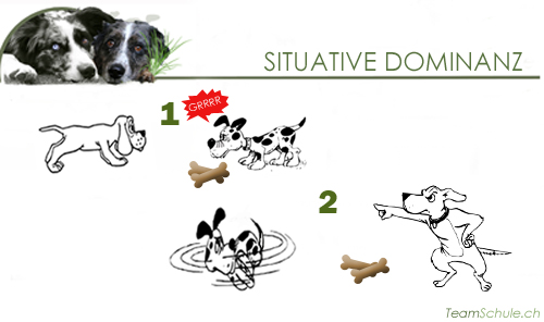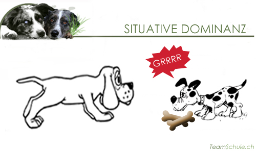 Die situative Dominanz ist daher auch häufig in Situationen zu beobachten, wo es um den Besitz oder Erhalt von Ressourcen geht wie Plätze, Futter und ein Spieli. Aber auch ein gewöhnlicher Kieselstein oder ein gefundener Ast kann ebenso heftig verteidigt werden wie ein köstlicher Kauknochen.