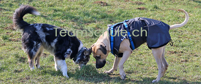 Betrachtet man die Rutenspitze erkennt man sehr oft, dass sie entweder in Richtung des anderen Hundes zeigt oder im Gegenteil, von ihm weg. Ersteres sagt: du bist gemeint. Zweiteres, ich will dich nicht herausfordern.