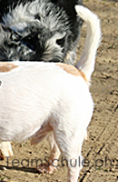 Hund re: Rutenspitze auf den Dackel zeigend