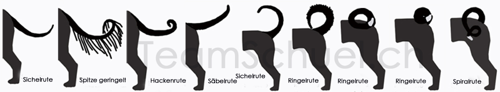 Ebenso vielfältig wie unsere Hunde, sind auch deren Ruten. Mal sind sie spitz und lang, mal zu einem Kringel gerollt, manche sind stark behaart andere wiederum ganz glatt. Hier eine kleine Auswahl: