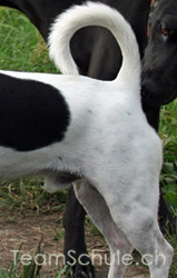 Hund li: Rute seitlich weg, Spitze zu den Anderen
