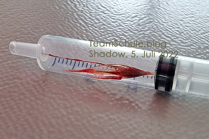 Trotzdem gehen wir so schnell wie möglich zurück zum Auto. Dabei beobachte ich Shadow weiter. Das Niesen wird bereits nach kurzer Zeit weniger und das Auge ist schon längst wieder normal geöffnet. Sicherheitshalber rufe ich aber doch noch meinem Tierarzt an. Und weil sie meinen Verdacht ernst nehmen, verweisen sie mich an die Klinik, da sie nur dort die dafür notwendige Endoskopie durchführen können.