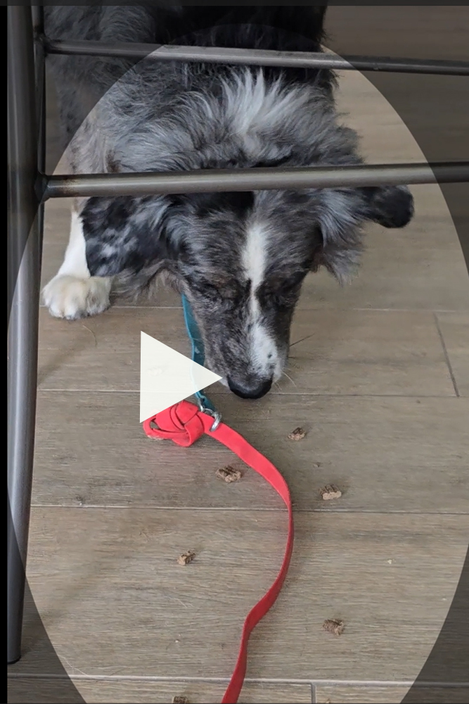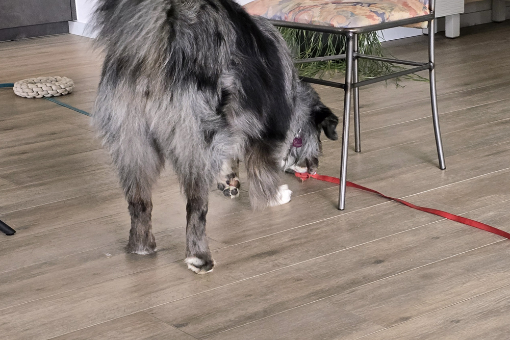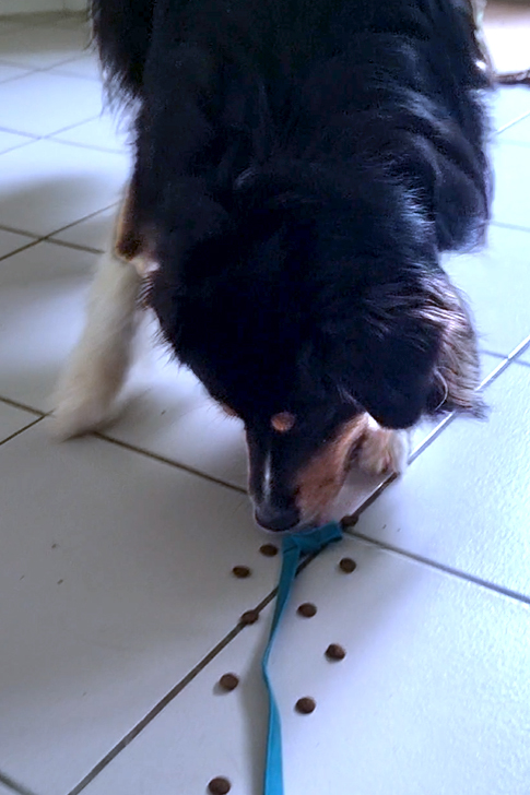 Hier die erste Futterschlange für Shadow, der mit seinen sieben Jahren schon einige Erfahrungen mit Hindernissen und eigenständigen Problemlösungen mitbringt. Während er zu Beginn noch recht schnell unterwegs ist, erkennt man im Video sehr schön, wie er im Verlauf der Suche immer ruhiger wird und auch mal kurz innehalten und konzentriert schlucken kann.