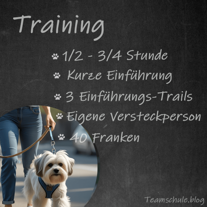 Das Training dauert eine halbe bis dreiviertel Stunde und kostet 40.00 Franken. Bring einfach eine Begleitperson mit, die Lust hat, sich für deinen Hund zu verstecken.
